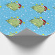 Niedlicher, fröhlicher, grüner Weihnachtsfrosch mit einer rot-weißen Weihnachtsmannmütze auf blauem Hintergrund mit vielen weißen Schneeflocken.