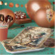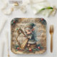 Eine whimsical Fee in einem grünen Weihnachtsgeschenk sitzt auf einem hölzernen Hocker und spielt eine goldene Harfe