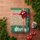 Moderne Weihnachtsgeschenkpackung für Kinder mit den Worten "Frohe Weihnachten" in stilvoller Typografie, eine personalisierte Hingabe, die jetzt "To Amber / with Liebe / from Santa" liest, Schneeflocken, und ein Muster mit Rentieren, Weihnachtsbäumen, Baubles, Schneeflocken, Schneemännern, Lebkuchenmännern, Strümpfen und Geschenkboxen. Auf grünem Hintergrund.