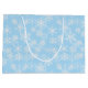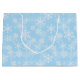 Die Geschenktasche aus Papier wird in blau mit einem festlichen Schneeflockenprint gezeigt. Passen Sie diese Geschenktasche an oder kaufen Sie, wie es ist.