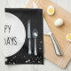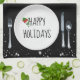 Snowman auf Happy Holidays Text auf weißer Platte und Silberware auf schwarzem Hintergrund und Schneeflocken. Die Hintergrundfarbe kann geändert werden.