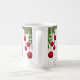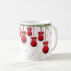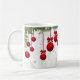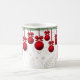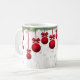 Rote, fantasievolle Weihnachtsschmuckstücke, die von einem Hauch von Nadelbäumen und heiligen Garnelen, überlagert auf einem Hintergrund von hellen Blattgemälden, eine wunderschöne Tasse für die Ferien!