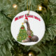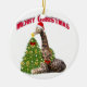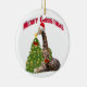 Adorable WeihnachtsGiraffe mit seiner Weihnachtsmannmütze und verziertem Weihnachtsbaum - er platziert den Stern auf den Baum