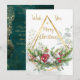 Die elegante Weihnachtskarte besteht aus flauschigen Blume aus Aquarellwolle, Eukalyptus-Blätter, Kiefernbrancheln, roten Beeren und Weihnachtsbaubles. Auf der Rückseite - goldenes Splash-Muster auf dunkelgrünem Hintergrund. Sie können Text nach Ihren Anforderungen anpassen.