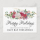 Weihnachtsgrün mit Heiligen und Beeren, Eukalyptus und Kiefern. Rot-weiße Rose verleihen der Touch eine wunderschöne Blumenpracht, weiße und rot gestreifte Weihnachtsschmuck und Bonbons verleihen dem Ganzen eine schöne Urlaubsatmosphäre. Ein goldener Swirl verleiht dem Ganzen ein gehobenes Ambiente. Auf der Vorderseite und auf der Rückseite der Postkarte sind die Feiertagsgrüße enthalten. Der gesamte Text ist bearbeitbar.