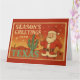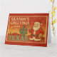Feiern Sie Weihnachten mit einem texanischen Twist! Diese Grußkarte im Vintage-Stil zeigt einen fröhlichen Weihnachtsmann, der neben einem Kaktus winkt, der mit roten Ornamenten geschmückt ist, vor einem warmen Wüstensonnenuntergang. Mit Retro-Postkarten-Vibes und fetter „Weihnachtsgrüße aus Texas“-Typografie bringt dieses Design Südwest-Stil in Ihre Weihnachtswünsche. Perfekt, um Lone-Star-Liebe und festliche Stimmung über die Meilen hinweg zu senden.