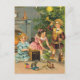 Ein schönes Weihnachtsbild von drei Kindern, die mit ihren neuen Spielzeugen spielen, inklusive einer Musikbox, einer Puppe und einer Spielzeugtrompete.