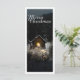 Die Karte zeigt eine stimmungsvolle, winterliche Szene mit einer kleinen, beleuchteten Holzhütte inmitten eines schneebedeckten Waldes. Die warme Lichtquelle im Inneren schafft einen schönen Kontrast zur dunklen, friedlichen Umgebung. Die elegante weiße "Frohe Weihnachten" verleiht dem Motiv eine festliche Touch. 🎄 ✨