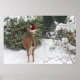 Weihnachten Hirsch buck mit einer Weihnachtsmannmütze stehend im Schnee, wie mehr Schnee fällt. Das Reh liegt neben einigen grünen Büschen, die auch im Winter in dieser zauberhaften Szene eines Tieres schneebedeckt sind.
