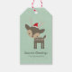 Frohe Festtage personalisierte Geschenkmarke. Ein niedliches und festliches Design mit minimalistischem Hipster. Charmante Illustration eines braunen Waldhirsches mit roter Weihnachtsmannmütze - Hipster Stil. Set auf einem grünen Hintergrund im Retro. Personalisieren Sie mit Ihrem Namen.