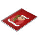 Design mit einer Illustration eines niedlich lächelnden glücklichen Kleinkindes, trägt er ein rot-weißes Weihnachtskostüm und hält ein Geschenk, mit bearbeitbarem Textvorlage für Ihren Namen oder Ihre Nachricht, Weihnachtsfeiertagsdesign mit rotem Hintergrund