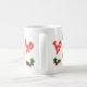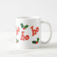 Eine weiße Ringer-Tasse mit Jäger-grünem Rand und Griff mit "ho ho ho ho" in roten und goldenen Buchstaben und heilig, aus einem handgemalten Papier Collage Design von Judy Adamson. Dieses Design ist auch als Weihnachtskarte und auf Geschenken und Kleidung erhältlich.