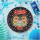 Das ist ein fröhliches Weihnachtsdesign mit spielerischen Elementen, Hirsch, Eule, Pinguin, Weihnachtsbaum, Mistletoe, Kuchen, Sternen, Geschenken, Bogen, einem großen goldenen Herz und einem besonderen Wunsch für ein glückliches Neues Jahr.