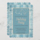 Das ist ein ruhiger, winterlicher Weihnachtskartenhintergrund mit zarten hängenden Ornamenten und festlichen Elementen wie Sternen, Schneeflocken und Zweigen von Bäumen. Der Hintergrund ist ein sanftes Blau mit subtilen, frostigen Mustern, die eine ruhige, Urlaubsatmosphäre hervorrufen.