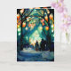 Die Weihnachtskarte bietet eine Abend-Ansammlung in einem schneebedeckten Wald unter den Bäumen mit leuchtenden Lichtern. Die Kunst ist künstliche Intelligenz unterstützt Wasserfarbe, und stilisiert auf Alphonse Mucha Stil.
