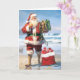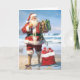 Eine lebendige, tropische Strandszene mit einem klaren, blauen Himmel. Der goldene Sand erstreckt sich so weit wie möglich vom Auge aus und verschmilzt mit dem kristallklaren Wasser des Ozeans. Im Vordergrund wird der Weihnachtsmann in seiner traditionellen Kleidung dargestellt. Der Weihnachtsmann ist barfuß und hat seine Hose aufgerollt, um im flachen Wasser des Ufers zu waten. Er hält einen großen, mit farbenfrohen Spielzeug gefüllten Brettersack über seiner Schulter. Die rosigen Wangen des Weihnachtsmanns und sein fröhlicher Ausdruck zeigen, dass er seine Zeit am Strand voll und ganz genießt. Das Design vereint den skurrilen und lustigen Geist der Urlaubssaison mit einer einzigartigen Drehung auf das traditionelle Bild des Weihnachtsmannes und macht es zu einer unvergesslichen und herzlichen Grußkarte für jeden, der sie empfängt.