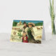 Dies ist eine wunderschöne Weihnachtskarte einer elegant gekleideten jungen Familie auf dem Weg zur Kirche. Der Vater ist in einem schwarzen Mantel mit braunem Fell und trägt einen klugen, hohen Hut. Die Mutter ist in einem grünen Mantel und einem großen Hut mit Federn gekleidet. Beide tragen die Heiligen. Das niedliche kleine blonde Mädchen ist in Rot gekleidet und hält ein Buch in der einen Hand und trägt einen Weihnachtsbaum in der anderen. Im Schnee hinter ihnen sind Rentiere und die Kirche kann man in der Ferne sehen. Die Karte lautet: "Ein frohes Weihnachtsfest". Das ist wirklich eine schöne Weihnachtskarte für die Familie.