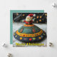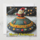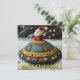 Ein skurriler Weihnachtsmann und UFO Weihnachtskarte mit UFO/UAP und Santa in einem Raumschiff. Dies ist eine flache, zweiseitige Karte. An der Front steht: Frohe Weihnachten. Der Rücken sagt: Und ein UFO Jahr!