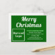 Frohe Weihnachten! Einer der bekanntesten Feiertage des Jahres. Es ist auch eine der besten Jahreszeiten, um Ihr Unternehmen zu werben oder Ihren Markennamen für Kunden oder Kunden zu fördern. Individuell gestaltbare Urlaubspostkarte, die Sie mit Ihrer Firmenmarke und mit Weihnachtsgrüßen versehen können. Passen Sie es an und nutzen Sie es, um Ihre Kunden oder Kunden an diesem Weihnachtsfest zu begrüßen. Sie können es auch als Marketing-Material verwenden, um Ihr Unternehmen zu werben oder Ihren Markennamen zu fördern. Individuell gestaltbare Ferienpostkarte, mit der Sie Markenbewusstsein schaffen können. Urlaubspostkarte für Dezember oder Weihnachten im Juli. Designfarben sind hellgrüne und weiße Texte auf grünem Hintergrund. Um diese Postkarte anzupassen, geben Sie Ihren Firmennamen, Ihre Adresse, Telefonnummer, E-Mail, Website oder Social Media-Seite ein und laden Sie Ihr Firmenlogo hoch. Nach dem Eintippen von Texten und dem Hochladen von Logos, bitte Karo des Erscheinungsbildes. Wenn Ihnen das Aussehen gefällt, können Sie jetzt Ihre Bestellung aufgeben. Wenn Sie die Größe ändern und die Texte und das Logo verschieben müssen, um auf diese Postkarte zu passen, wechseln Sie bitte im Design-Tool. Sie können auch den Stil des Schriftartes, die Farbe des Schriftartes und die Hintergrundfarbe im Designwerkzeug ändern. Sie können auch Bilder und Texte auf der Rückseite des Designs hinzufügen. Frohe Weihnachten! Wir wünschen Ihnen mehr Umsatz in dieser Feriensaison.