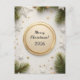 Helle Urlaubskarte mit einem runden, von einem goldenen Kranz gerahmten Zentralteil, festlicher Vegetation und dekorativen Schneeflocken auf einem lebendigen roten Hintergrund. Ideal für saisonale Grüße oder festliche Designs.