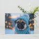 Diese bezaubernde Weihnachtskarte bietet einen niedlichen Mops mit einem gemütlichen blauen Strick Hut und Schal, der vor einem Hintergrund von blinkenden Lichtern und einer verschneiten Landschaft posiert. Dieses herzerwärmende Bild eignet sich perfekt, um Urlaubsjubeln zu verbreiten und Hundefreunden und Weihnachtsliebhabern gleichermaßen ein Lächeln zu vermitteln.