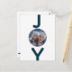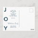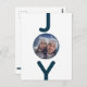 Eine einfache, trendige, minimalistische Weihnachtskarte in Blau und Weiß. Auf der Vorderseite: Ein schick weißer Hintergrund, mit dem Wort JOY mit roten, fetten Buchstaben geschrieben. Der Buchstabe O wird als Foto verwendet. Personalisieren und fügen Sie Ihr eigenes Foto. Zurück: Weißer Hintergrund und blauer Text. Fügen Sie Ihre eigenen Feiertaggrüße und Familiennamen hinzu. Die Buchstaben im Wort JOY als Dekoration.