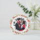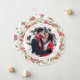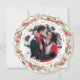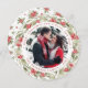 Diese runde Weihnachtskarte ist mit einem Kranz mit grünem Blattwerk und roten Beeren mit roten Poinsettien versehen. Der Gruß ist in kurvigem Text angeordnet, in dem steht: "Frohe Weihnachten und ein glückliches neues Jahr." Sie können Ihren Namen und Ihr Datum in die untere Hälfte einfügen. Der Rücken hat ein sich koordinierendes Poinsettia-Muster.
