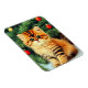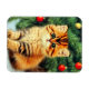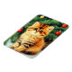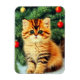 Magnet mit einer altmodischen Weihnachtskatze! Eine orangefarbene Kätzin mit schwarzen Streifen sitzt im Schnee. Hinter der Katze steht ein Weihnachtsbaum mit roten und gelben Ornamenten. Auch auf dem Schnee ist ein rotes Geschenk. Ein perfektes Geschenk für die Weihnachtszeit und Katzenliebhaber!