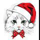 Illustration einer weißen Katze mit roter Weihnachtsmannmütze und einer roten Bug-Krawatte mit weißen Polka-Punkten, die Katze hat grüne Augen und eine rosa Nase, der Stil ist schwarz-weiß mit roten Akzenten, der Hintergrund weiß.