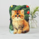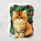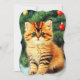 Karte mit einer Weihnachtskatze im Jahrgang! Eine orangefarbene Kätzin mit schwarzen Streifen sitzt im Schnee. Hinter der Katze steht ein Weihnachtsbaum mit roten und gelben Ornamenten. Auch auf dem Schnee ist ein rotes Geschenk. Ein perfektes Geschenk für die Weihnachtszeit und Katzenliebhaber!
