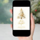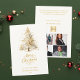 Ein zarter, beige Hintergrund. Mit einem schneebedeckten Weihnachtsbaum dekoriert. Personalisieren und fügen Sie 4 Fotos, Ihren Firmennamen und Ihre Grüße. Frohe Weihnachten wird mit einem eleganten, handgeschriebenen Schriftart geschrieben.