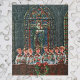 Vintage Illustration Weihnachtsfeiertag religiöses Design mit einem Chor von Kindern, Jungen und Mädchen, die Musik singen. Eine Kapelle mit schönen Buntglasfenstern mit der Madonna und dem Kind und ein Weihnachtskranz mit Bogen.