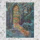 Vintage Illustration Weihnachtsfeiertag religiöses Design mit einem architektonischen Element, eine Buntglasfenster snowscape. Eine wunderschöne Kapelle mit Licht, die auf den neuen umgestürzten Schnee im Freien in der Wintersaison Landschaft kommt.