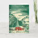 Vintage Illustration Weihnachtsfeiertag religiöses Design mit einer malerischen Kapelle in einer niedlichen Bergstadt. Eine Winterlandschaft mit Bergen, Bäumen und Schnee. Das Original ist ein rotes und grünes, feines Wasserfarbenbild.