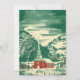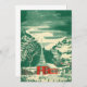 Vintage Illustration Weihnachtsfeiertag religiöses Design mit einer malerischen Kapelle in einer niedlichen Bergstadt. Eine Winterlandschaft mit Bergen, Bäumen und Schnee. Das Original ist ein rotes und grünes, feines Wasserfarbenbild.