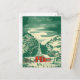Vintage Illustration Weihnachtsfeiertag religiöses Design mit einer malerischen Kapelle in einer niedlichen Bergstadt. Eine Winterlandschaft mit Bergen, Bäumen und Schnee. Das Original ist ein rotes und grünes, feines Wasserfarbenbild.