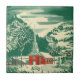Vintage Illustration Weihnachtsfeiertag religiöses Design mit einer malerischen Kapelle in einer niedlichen Bergstadt. Eine Winterlandschaft mit Bergen, Bäumen und Schnee. Das Original ist ein rotes und grünes, feines Wasserfarbenbild.