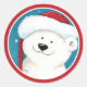 Niedliche Aufkleber mit einem Bild eines niedlichen Eisbären mit einer Weihnachtsmannmütze, die auf einen Kreis zugeschnitten wurde. Roter Hintergrund. Perfekt für den Einsatz als Umschlag Aufkleber oder um an Geschenken zu bleiben. Artwork © Lisa Marie Robinson Alle Rechte vorbehalten. Es ist verboten, diese oder eines unserer Bilder ohne schriftliche Genehmigung zu benutzen oder zu duplizieren.