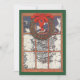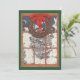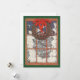Vintage Illustration Frohe Weihnachts Weihnachtszeit Landschaft Design. Eine Schneeszene mit Blick auf Schneebäume im Wald und ein Haus in der Ferne durch ein 9-Fenster mit einem Kiefernkranz mit einem roten Bogen. Ein architektonisches Element.