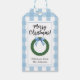 Verzieren Sie Ihre Geschenke mit diesen hübschen Weihnachtsgeschenktafeln. Der karierte Hintergrund ist hellblau und weiß, und der Kranz in Aquarellfarben mit einem hellblauen Bogen.