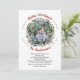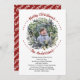 Diese Weihnachtskarte ist mit einem Kranz aus Grünpflanzen umgeben, der ein Foto der Familie umgibt. Die Wörter "Frohe Weihnachten" kurvieren anmutig über dem Bild, mit dem Familiennamen schön unten in einem fließenden Skript geschrieben, betont durch rote Punkte. Unter dem Foto wird eine herzliche Nachricht in schwarzer Tinte platziert, die dem Empfänger warme Wünsche gibt. Auf der Rückseite zeigt ein tiefroter Hintergrund ein diagonales Muster des Satzes "Frohe Weihnachten" in Weiß.