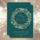Ein Kranz aus Poinsettien, Strümpfen, Kiefernzapfen, Bäumen und mehr in Gold auf einem dunklen aquamarinen Hintergrund gezeichnet mit Fröhlichen Weihnachten in der Mitte und Ihre Personalisierung am unteren Ende sind auf diesen flachen Weihnachtskarten ohne Foto vorgestellt. *ADD Fotos mehr Details auf der Rückseite, auch. Wählen Sie Matte für schwerstes Papier und High Definition für beste Druckqualität.