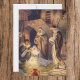 Vintage Illustration Weihnachtsfeiertag religiöses Bild mit einer klassischen Krippe. Eine Christliche religiöse Familienszene mit Maria, Joseph, dem Säugling Jesus Christus in der Leitung und den drei weisen Männern in Bethlehem. Die drei Hirten und Jesus.