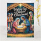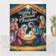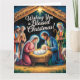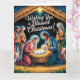 Eine klassische und ehrfürchtige Illustration der Weihnachtskrippe, die Maria und Josef zeigt, wie sie neben dem Baby Jesus knien, das in einer Krippe unter dem Stern von Bethlehem schläft. Die Szene, die in einem Stall spielt, wird durch die Anwesenheit von Hirten und kleinen Lämmern abgerundet und vermittelt die traditionelle Weihnachtsgeschichte. Das Bild enthält einen festlichen Gruß in Schreibschrift mit den Worten: "Wir wünschen Ihnen ein gesegnetes Weihnachten!".