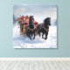 Zwei schwarze Pferde ziehen einen Schlitten mit bunten Weihnachtsgeschenken durch eine verschneite Landschaft