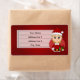 Design mit einer Illustration eines niedlich lächelnden glücklichen Mädchens mit kurz blonden Haaren, trägt sie ein rot-weißes Weihnachtskostüm und hält ein Geschenk; mit bearbeitbarem Textbogen für Ihren Namen oder Ihre Botschaft, Weihnachtsfeiertagsdesign mit rotem Hintergrund,