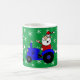 Santa auf einem blauen Traktor und schwarz-weiße Bullen mit Weihnachtsmannmützen auf einem grünen Hintergrund mit Schneeflocken. Tasse oder Tasse