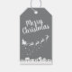 Dieses elegante, silbergraue Weihnachtsgeschenk-Tag zeigt die Silhouette des Schlittens des Weihnachtsmannes mit seinen Rentieren, die über den Häusern auf einem Sternenpfad fliegen. Der Text beider Seiten, in einem weißen und modernen Schriftart, ist vollständig anpassbar.