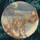 Vintage Illustration Viktorianisch Frohe Weihnachtsfeiertage mit Weihnachtsmann und seinem Rentier, der an Heiligabend Spielzeug ausliefert. Der Weihnachtsmann fliegt in einer kühlen Winternacht mit Vollmond am Himmel über den Schnee.