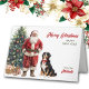 Auf der Vorderseite dieser niedlichen Urlaubskarte trägt ein Berner Hund einen roten Bogen und sitzt neben dem Weihnachtsmann. Daneben gibt es einen geschmückten Weihnachtsbaum, einen Korbweidekorb und Packungen. Der rote Text rechts steht für "MERRY CHRISTMAS", darunter ist "HAPPY NEW YEAR" grün. Ihre eigene Unterschrift ist unten grün und rot. Der gesamte Text, innen und außen, kann leicht auf alles geändert werden, was man möchte. Im Dog Village können Sie mehr Berner-Bilder und andere Aufnahmen der Rasse sehen.